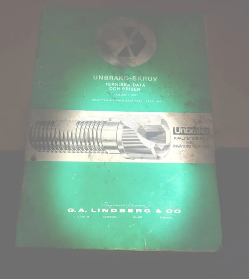 En gammal bok om Unbrako-skruvar med tekniska data och priser från 1967. Boken är i gott skick och kan vara användbar för samlare eller för att hitta information om äldre skruvar.Samt verko nr 10 annonsregistret 92 årgång 36