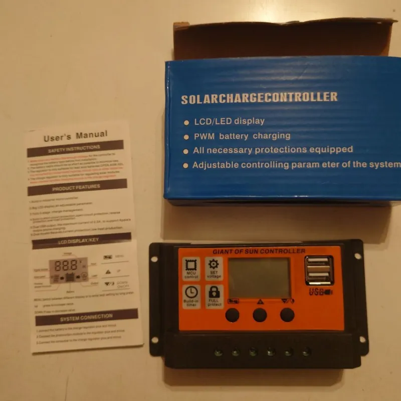MPPT solcellsladdningsregulator med LCD-display. Regulatorn hanterar 12V/24V systemspänning och har en maxström på 100A. Maximal PV-ingångseffekt är 1200W (12V) eller 2400W (24V). Den har PWM-batteriladdning och nödvändiga skydd. Justerbara parametrar finns tillgängliga.