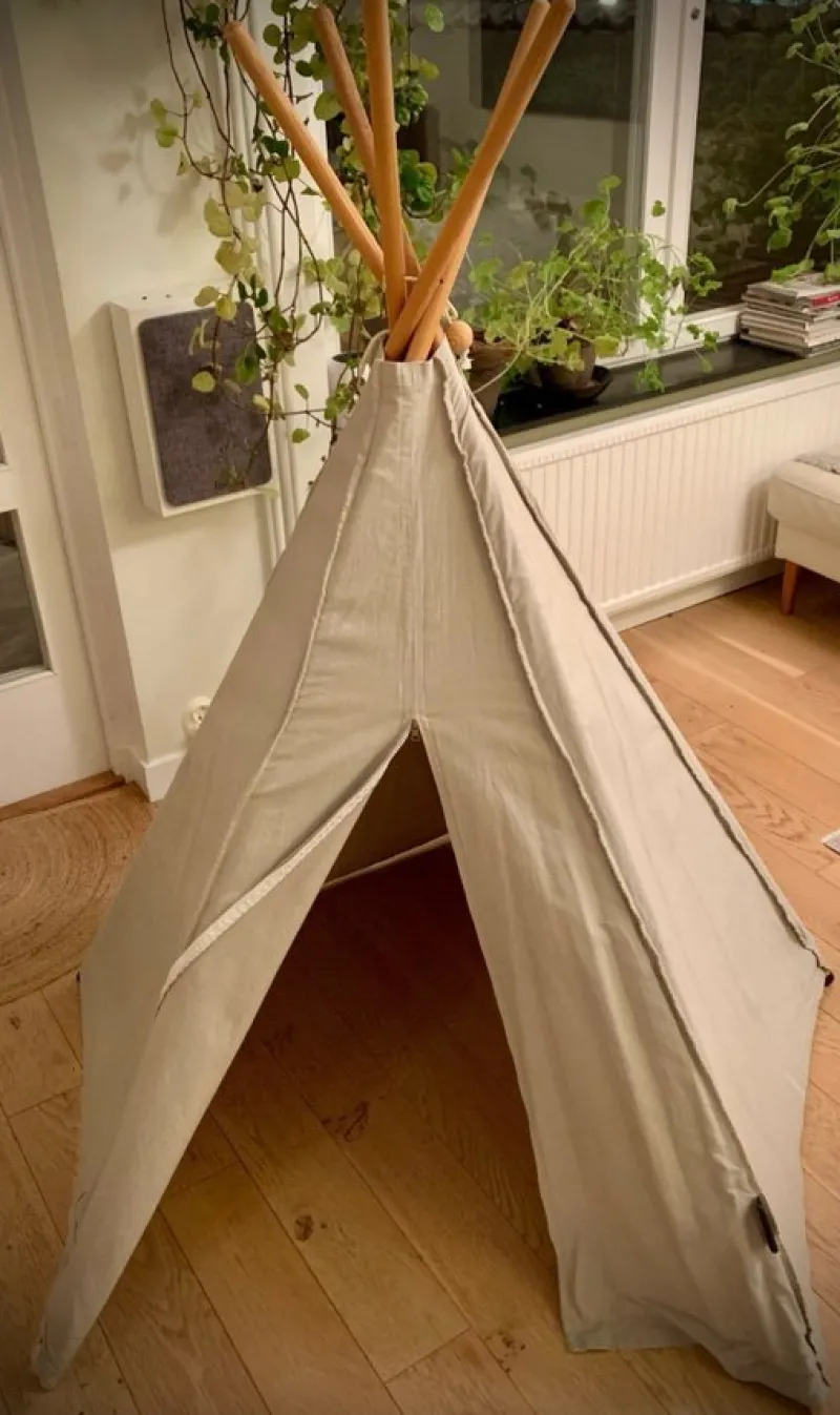 Material: 5 trästavar med plastkoppar som skydd mot golvet. Tältduk av naturfärgad bomull.