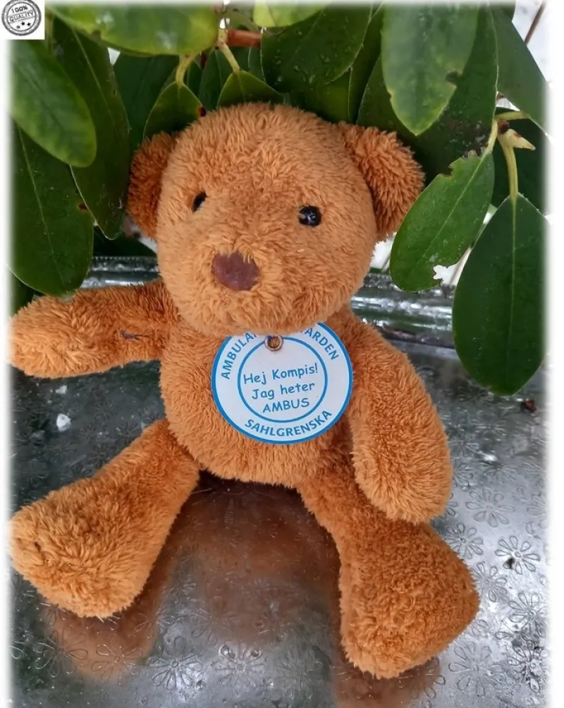 Varumärke & beskrivning: Charmiga Sahlgrenska Ambus Teddybjörnen – med emblemet på.