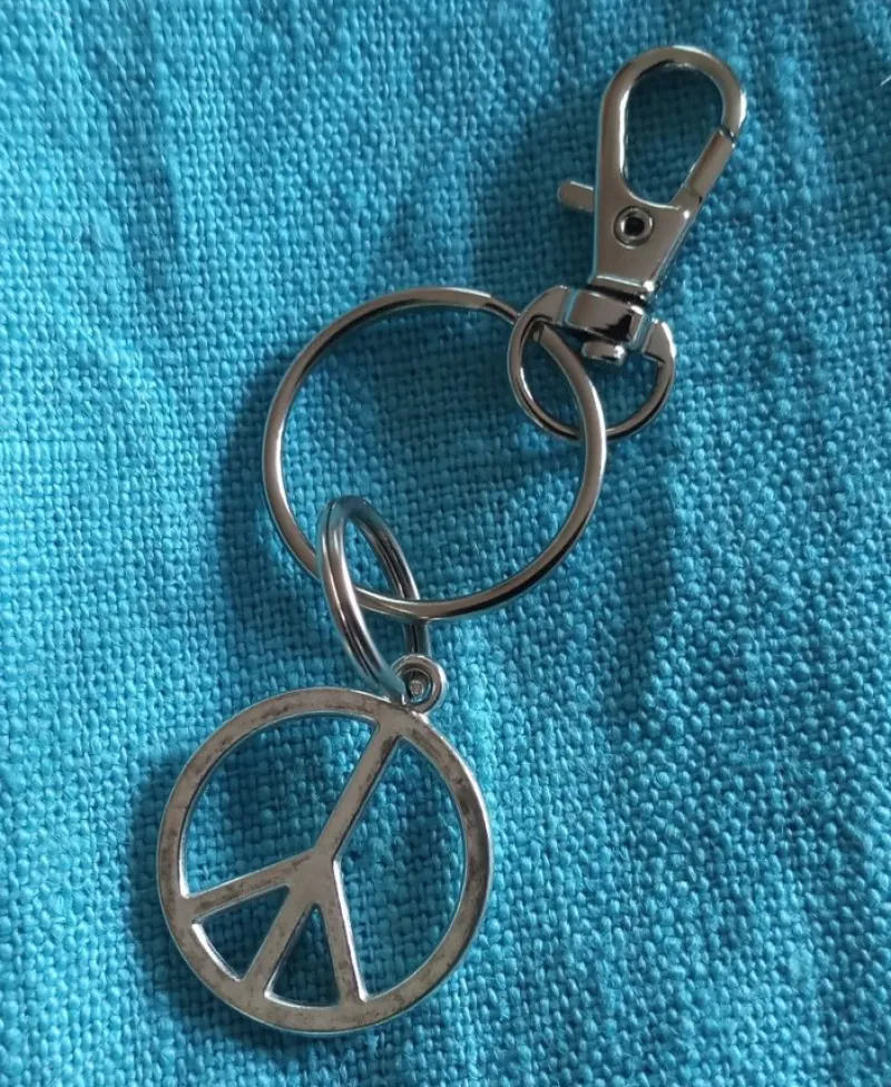 En nyckelring med ett fredsmärke och en hake. Perfekt som present.