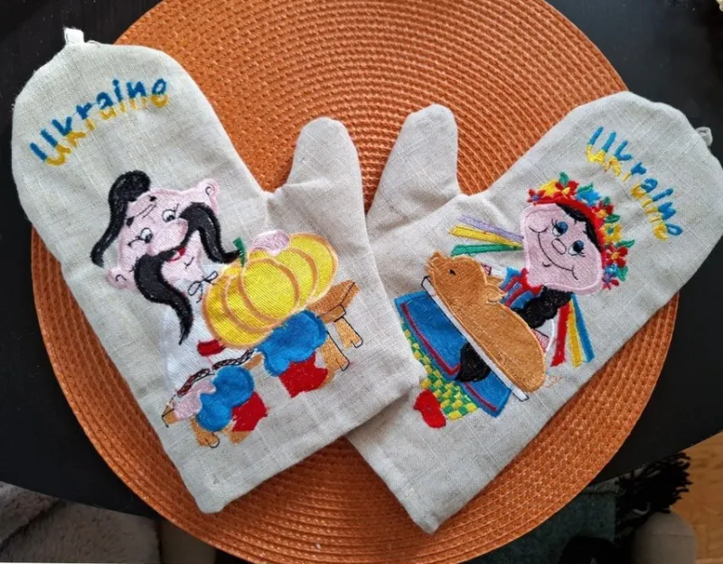 Två stycken oanvända grytvantar med broderade motiv från Ukraina.