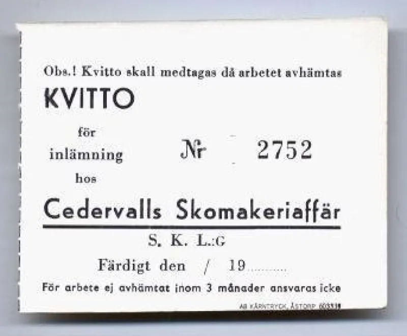 Äldre pollett / kvitto från Cedervalls skomakeriaffär.