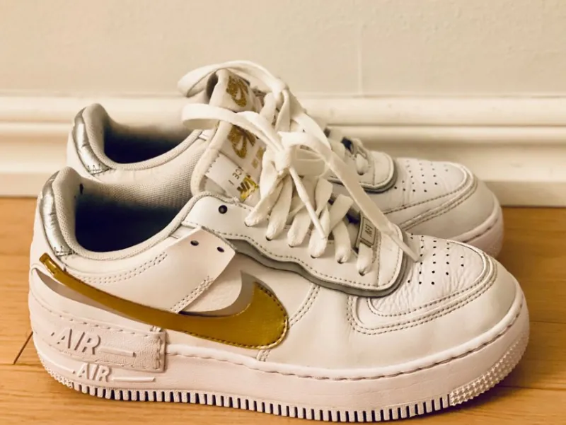 Snygga Nike Air Force 1 Shadow sneakers i vitt med gulddetaljer. Skorna är i fint skick och redo för en ny ägare. Perfekta för både vardag och festligare tillfällen.