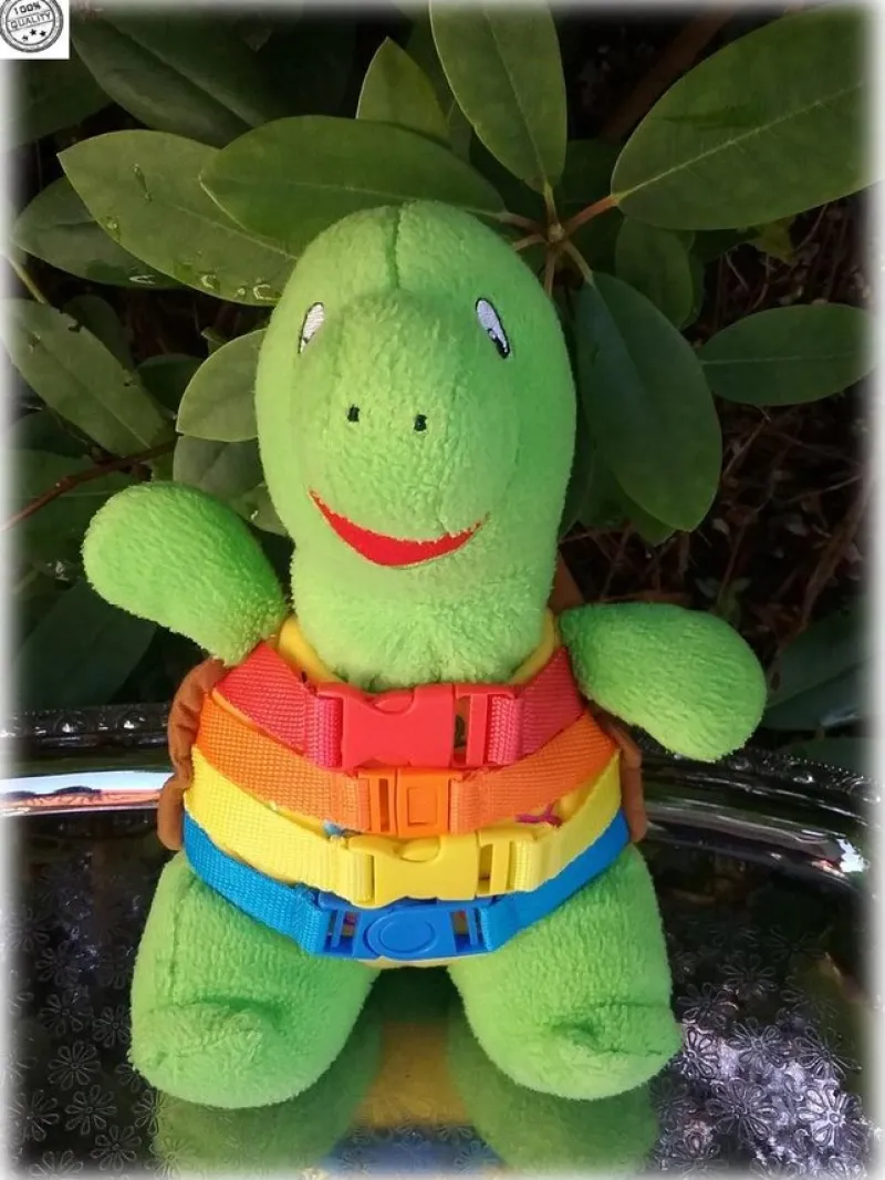 Varumärke & beskrivning: Söt sköldpadda som mjukdjur som man kan öppna baktill i skalet med dragkedja samt öppna upp spännremmarna och se siffrorna undertill. Barnet lär sig att öppna spännremmarna på olika sätt och även siffrorna som döljer sig baktill. Se bilden.