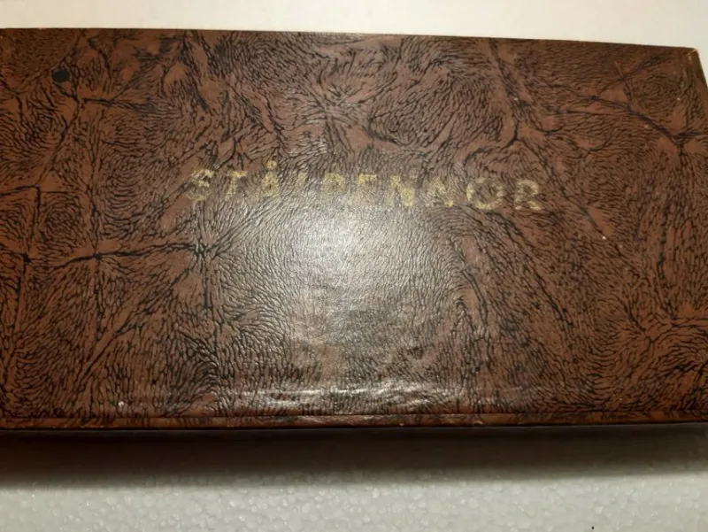 Försäljning av ett fodral med olika stålpennor. Märket på vissa fästen är Radius och Macnivens & Camepon. Fodralet är brunt och av hård kartong. Ca 80 st.