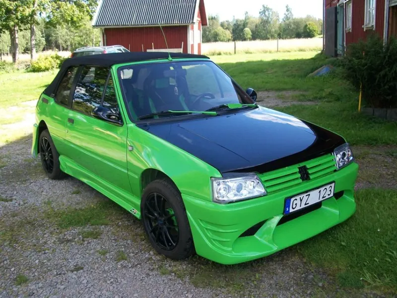 Peugeot 205 Cabriolet med svart tak. Bilen är utrustad med sportstolar, en kraftig ljudanläggning och en stor subwoofer. Bilen har även en digital klocka och en modern stereo. Bilen har gått 159864 km.