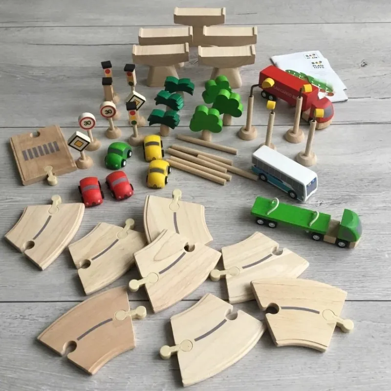 Många kompletteringsdelar till Plan Toys vägbana Deluxe, den är ej komplett själva körbanan.