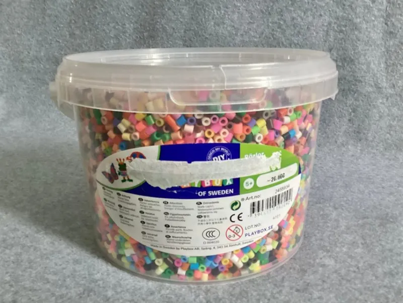 Stor hink med ca. 20 000 pärlor från Playbox of Sweden.