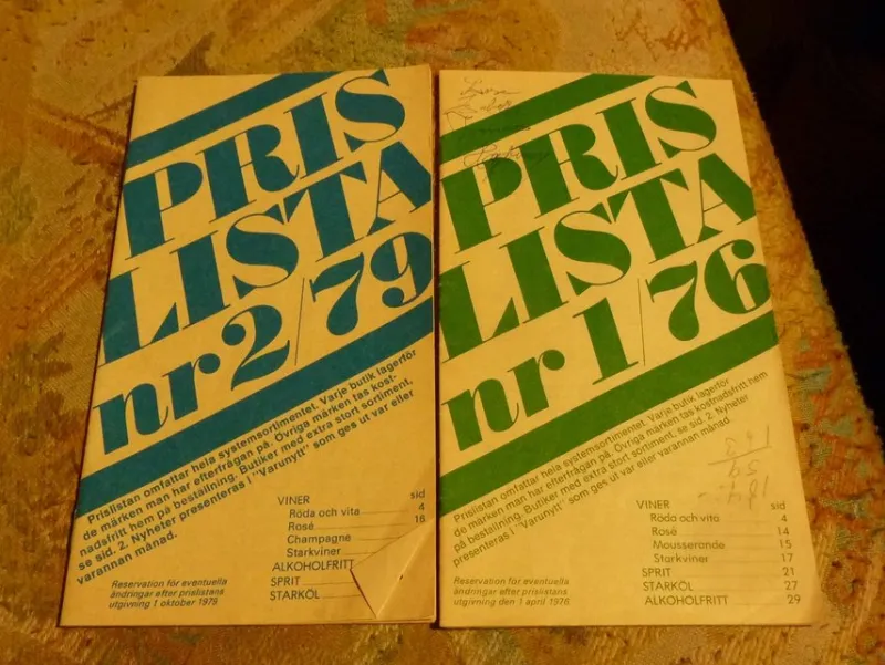 Två stycken Systembolagets prislistor från 1976 respektive 1979. Prislistorna innehåller information om olika sorters viner, starkviner och sprit. De ger en intressant inblick i Systembolagets sortiment under dessa år.