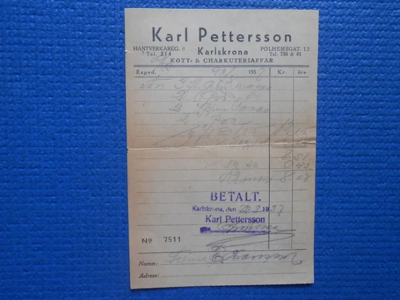 Tradera Räkning Karl Pettersson Kött & Charkuteriaffär Karlskrona^ Fraktsedlar & Fakturor