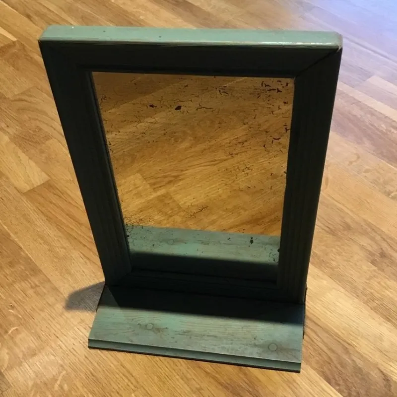 Äldre Liten spegel med hylla i en vacker, ljusgrön färg. Spegeln är enkel i sin design och ramen är tillverkad av trä.
