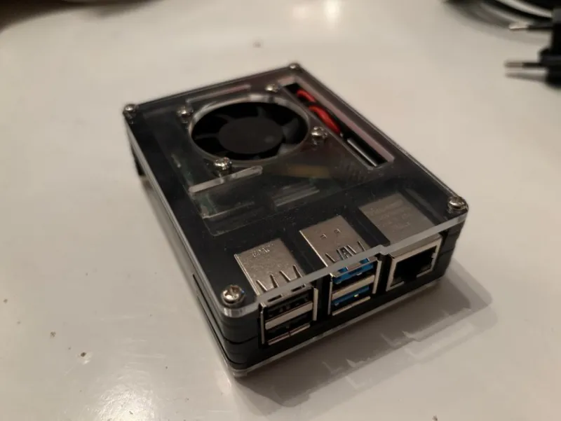 Raspberry Pi 4 model B i kompakt chassi med inbyggd kylfläkt.