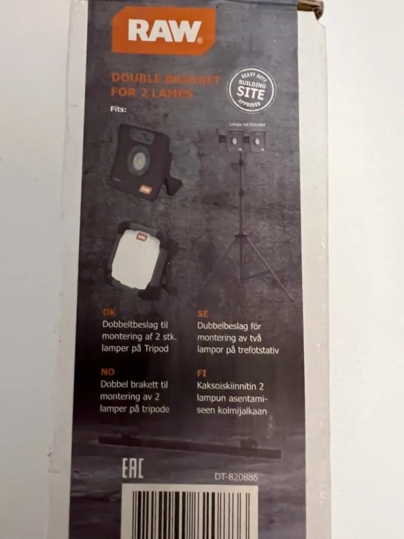 Dubbelbeslag från RAW, modell DT-820886, avsett för montering av två lampor på ett stativ. Passar för RAW lampor. Kan säkert passa till andra stativ oxå.