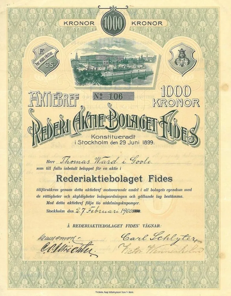 Rederi AB Fides, 1 000 kr, 1899, Stockholm, Utst. Thomas Ward, Bransch: Sjöfart, RSA:5285