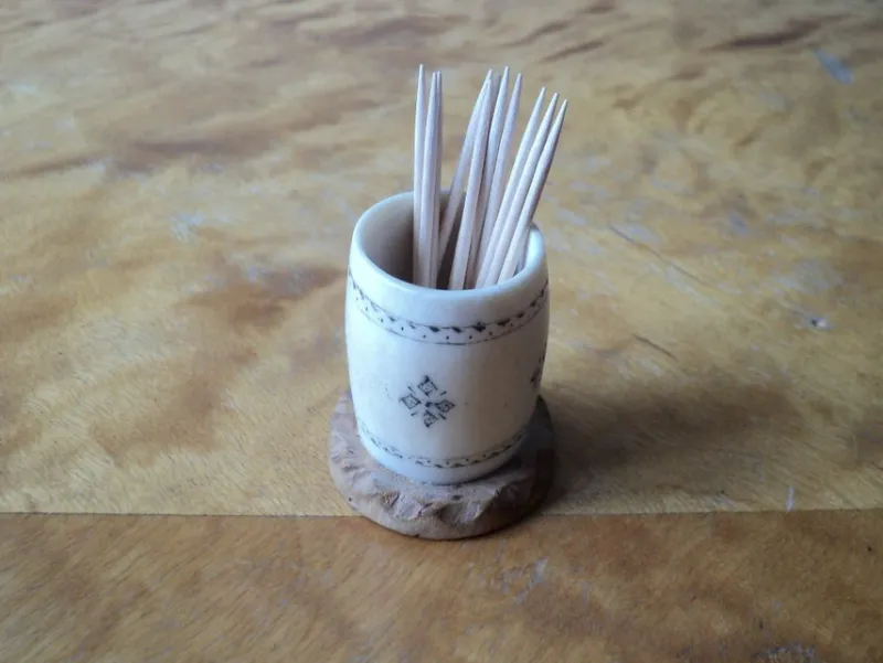 Tandpetarhållare i horn med fint mönster, enligt signaturen troligen gjord av Ivar Tuolja från Jokkmokk, i bra begagnat skick, se bilder.