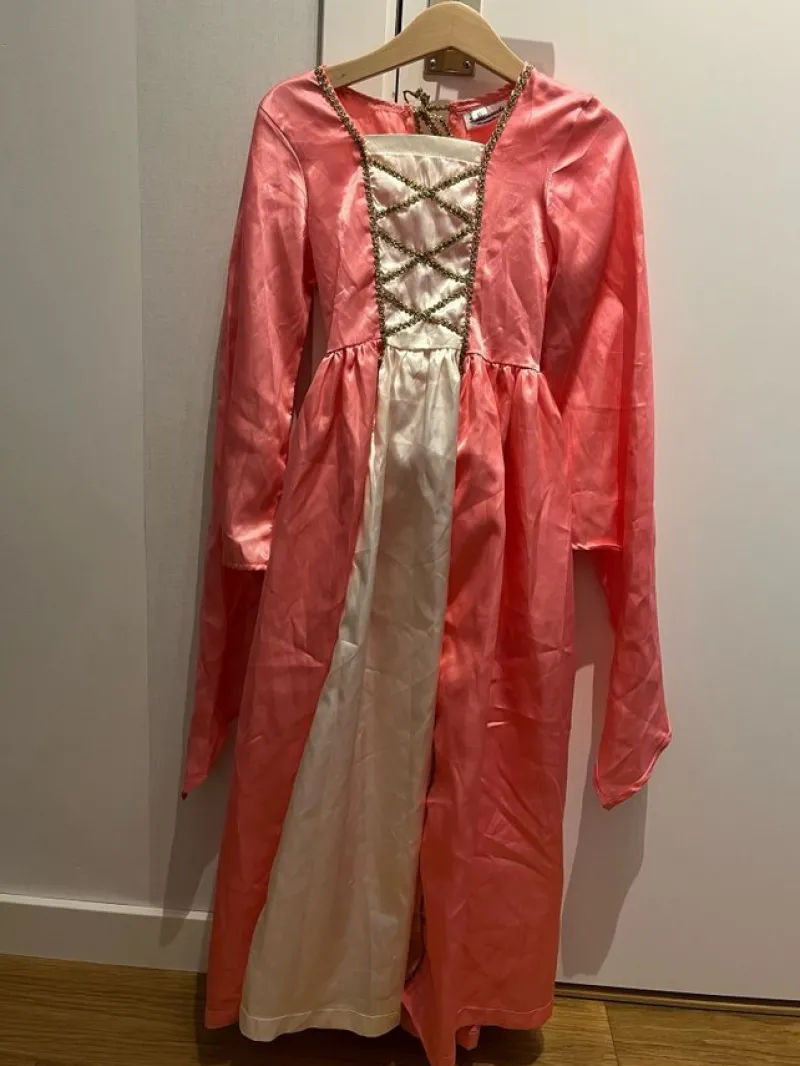 Säljer en prinsess klänning från Scaramouche köpt på medeltidsmarknad för ca 10 år. Passar för ålder 6 år. Använd skick, har lite skavanker. Snöret är lite trasig, söm börjar gå upp samt lite slitage.