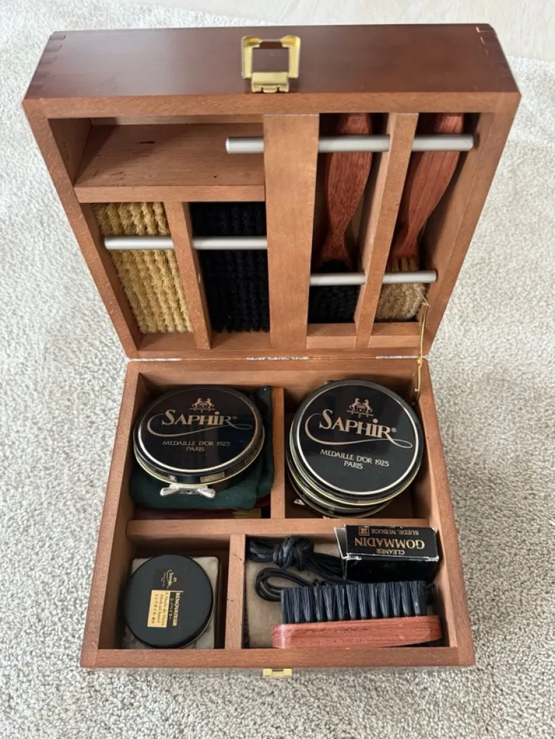 Innehåller Saphir Medaille d'Or skokrämer, borstar och tillbehör för skovård.