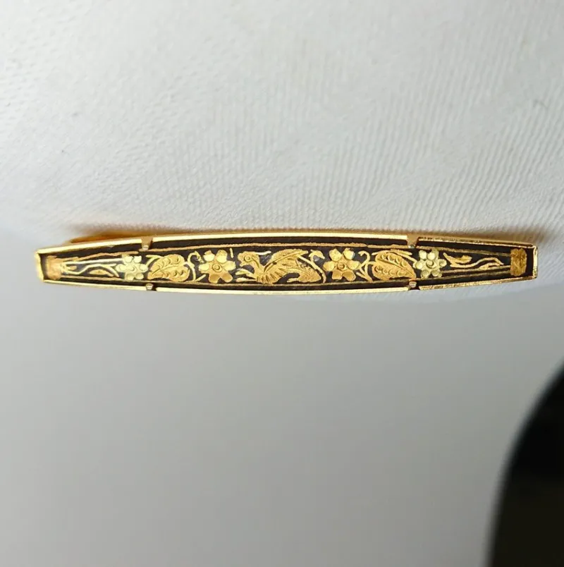 ELEGANT SLIPSHÅLLARE I GULD OCH SVART, I SÅ KALLAD TOLEDO TEKNIK, NIELLO MED SVÄRTAT STÅL MED GULDFLRGYLLNING. 55X7 MM. FINT SKICK.