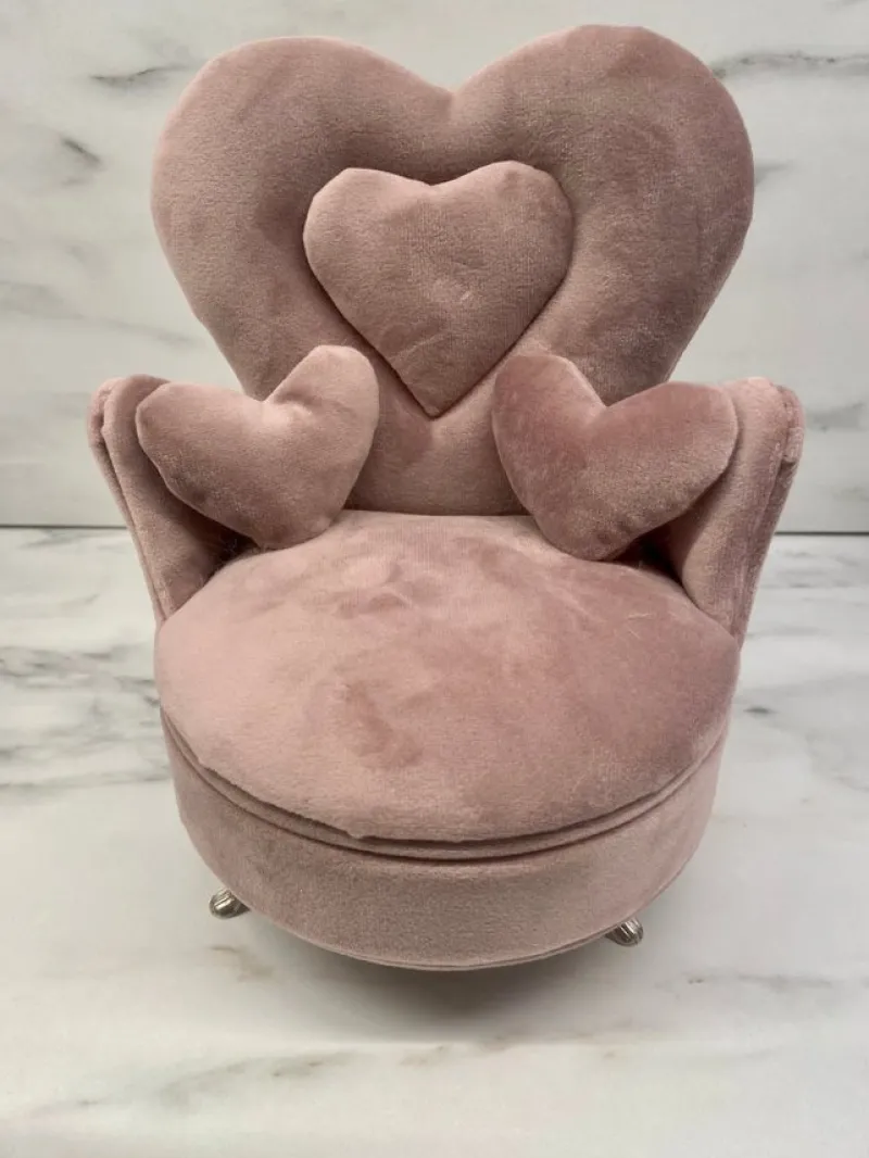 Smyckeskrin i form av en rosa fåtölj med hjärtformad rygg och två hjärtformade kuddar. Smyckeskrinet har en spegel inuti och plats för ringar.