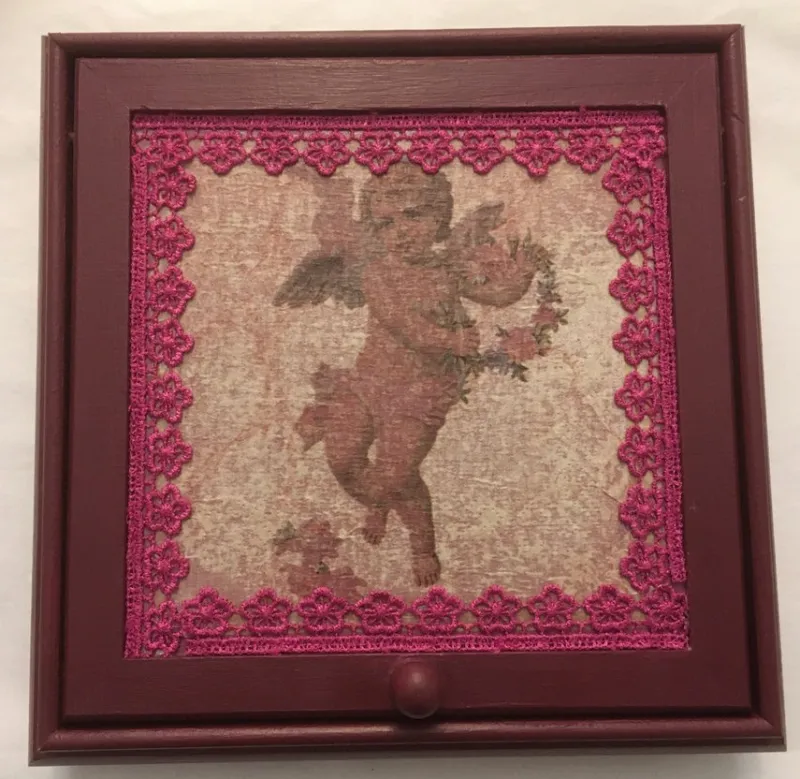 Smyckeskrin i trä med spegel i locket. Smyckeskrinet är dekorerat med spets och en bild av en ängel. Smyckeskrinet har tre fack inuti.