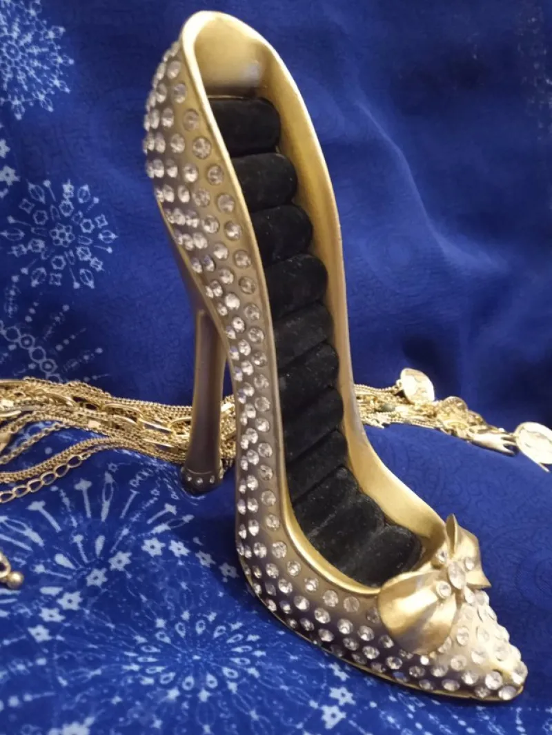 Snygg dekorativ ringhållare i form av klacksko med små strass är perfekt och idealisk för att organisera och visa upp dina ringar, studsörhängen och övriga smycken på ett elegant sätt.