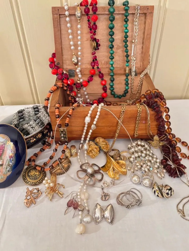 Diverse smycken i parti. retro och antika. En del av smyckena är i silver.