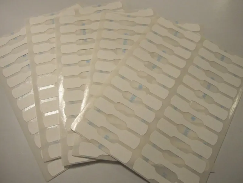 Tillverkade av klorfritt papper och lösningsmedelsfritt lim. Inget lim i mitten av etiketten för att kunna fästa på ringar och dylikt. Etiketterna mäter 10 x 49 mm. 10 mm är höjden, där den är bredast och med klister. 49 mm är längden på etiketten.