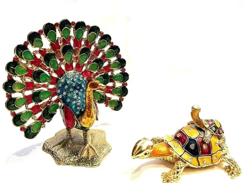 Tradera Smyckestillbehör<SKRIN – PÅFÅGEL OCH SKÖLDPADDOR, FÖRGYLLD METALL MED EMALJ OCH GLASSTENAR.