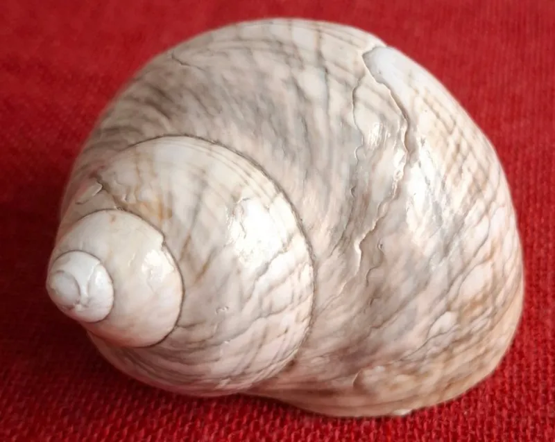 Gammal vacker snäcka i nyanser vit, grå, brun och blå. Den är naggad i kanten, annars I gott skick.