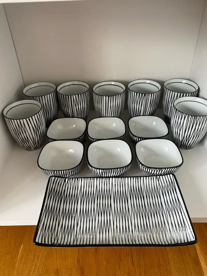 Säljer ett set med svartvita skålar och muggar. Perfekt för en modern och stilren dukning. Setet inkluderar flera skålar i olika storlekar och ett antal muggar. Skålarna och muggarna är i samma design med svartvita ränder.