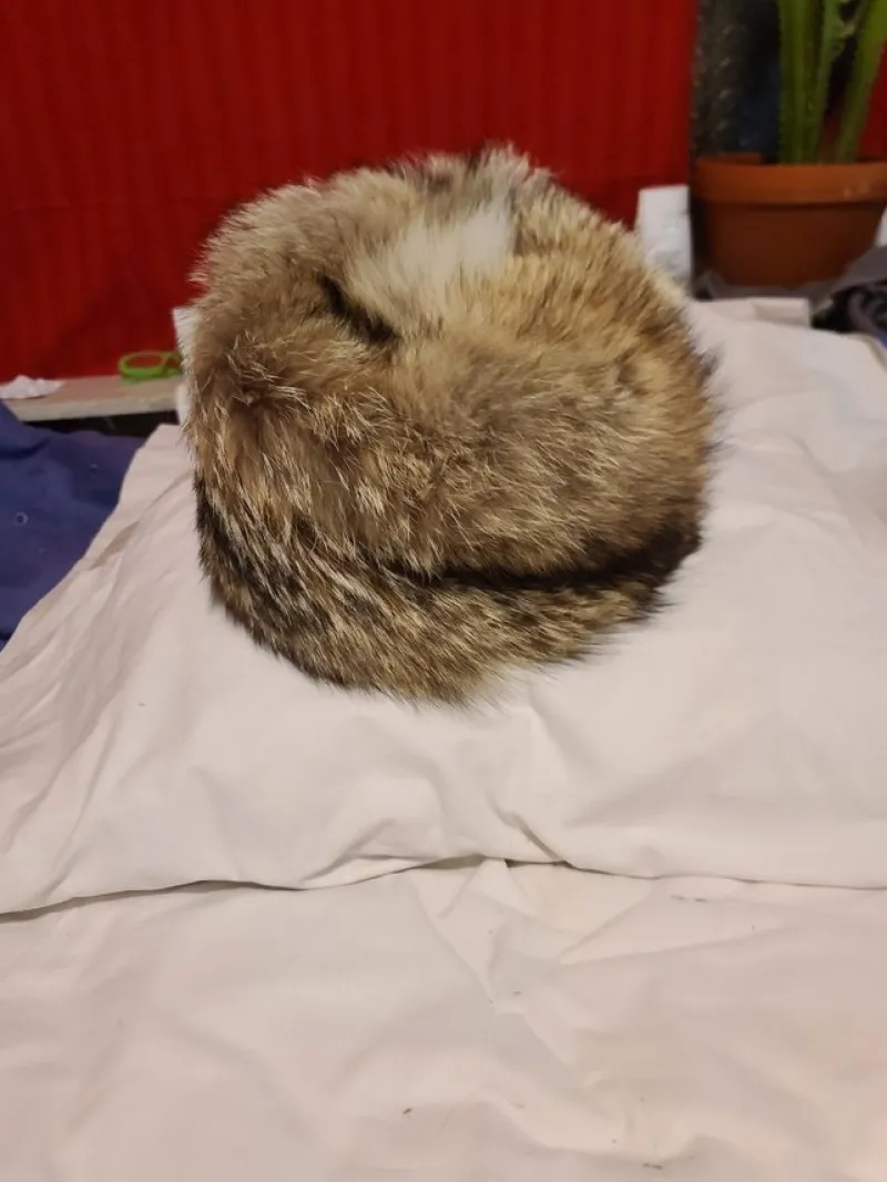 Söt och mysig varg pälsmössa i brunt och beige. Mössan är rund och fluffig med en lång pälskant. Märkt med 'Alvsjö Modeffar' och telefonnummer. Perfekt för kalla vinterdagar.