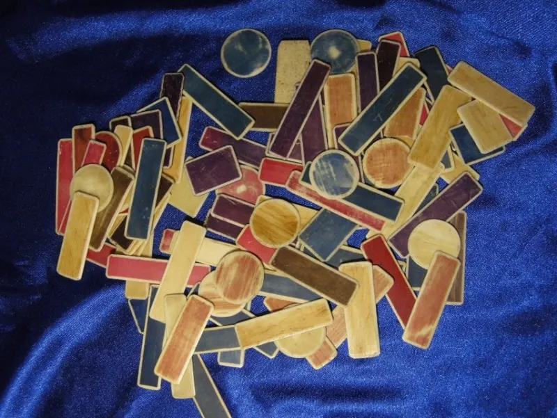 Mycket gamla spelmarker. De runda har en diameter på ca 3 cm. Kanske materialet är intressant. Kan vara ben, horn, plast eller nåt annat, jag vet inte
