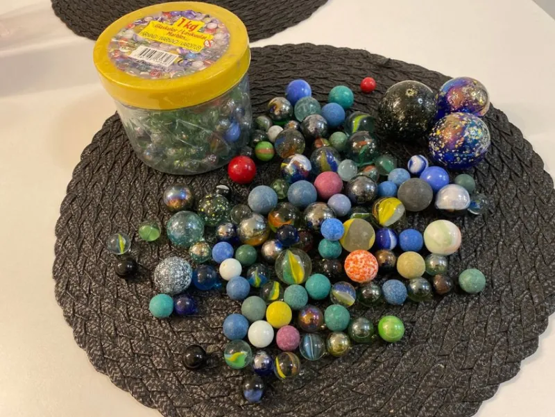Stort parti glaskulor i olika färger och storlekar. Ett mindre antal stenkulor finns också.