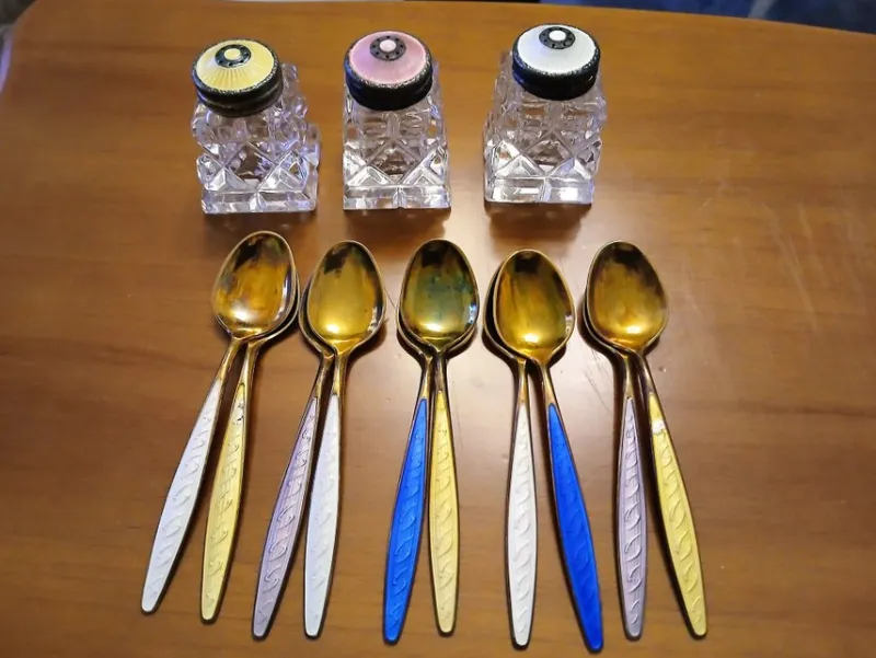 Säljes ett set med tre små sockerströare i kristallglas med lock i emalj och tio små skedar i sterling silver 925S med emaljhandtag. Märkta "STERLING 925S NORWAY"