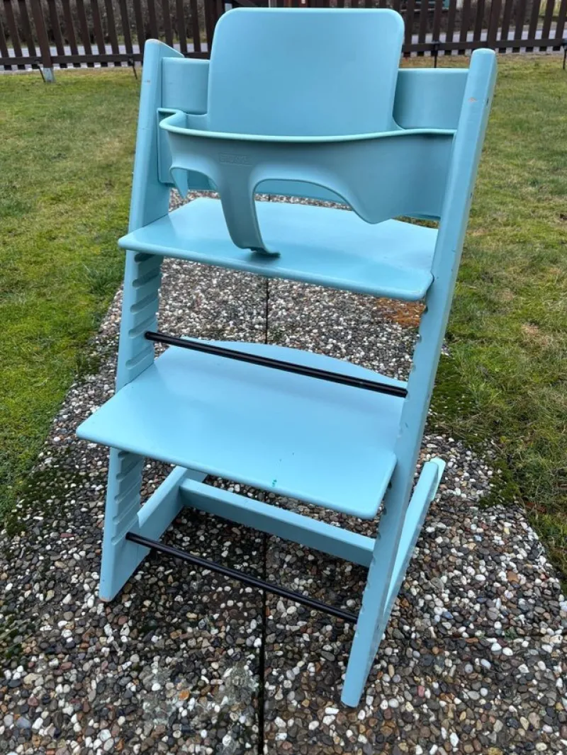 Stokke Tripp Trapp av nyare modell med babyset. Går bra att använda även med plast bricka, nyföddset. Stabil och funktionsduglig. Ej målat – i original färg. Färg – ljusblå. Bra använd skick med några skavanker i färgen- se bilder. Fast pris