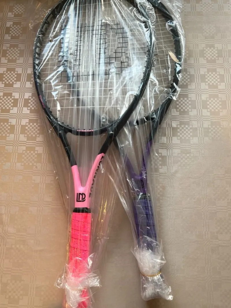 Säljer två nya Lunnade tennisracketar. Racketarna är oanvända och kommer i sina originalförpackningar. En racket har rosa handtag och den andra lila. Medföljer gör även ett racketfodral.