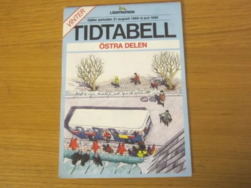 Länstrafikens tidtabell för östra delen av länet, vinterperioden 1989-1990. Innehåller information om buss- och tågtrafik, linjekartor och tidtabeller för olika sträckor. Bra för den som är intresserad av kollektivtrafikens historia i Jönköpings län.