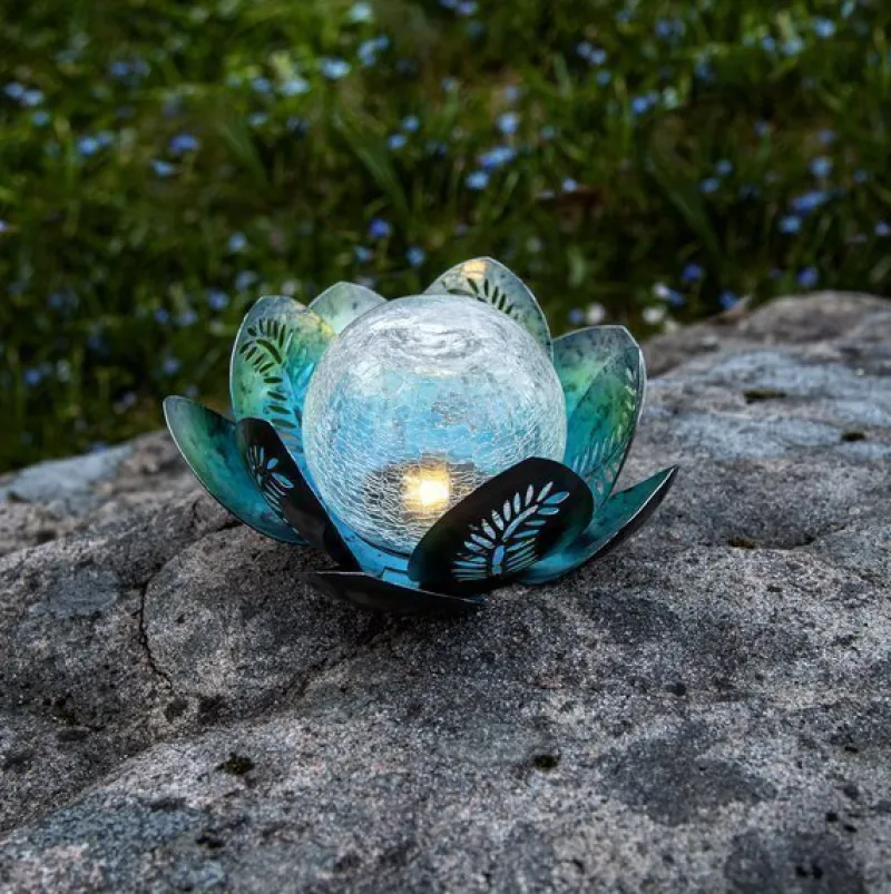 Den solcellsdrivna dekoration Lilly har silver-blå metall löv med en stor transparent glaskula inuti. Den är ca 24 cm i diameter och 12 cm hög. Den lyser med ett varmvitt sken genom glaskulan. Denna solcellsdekoration är fin att dekorera med i trädgården eller på en balkong. Placera belysningen där solen kan nå panelen under dagen för att få ultimat laddning till det medföljande batteriet.