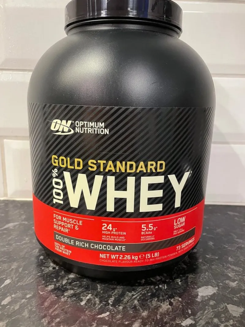 Oöppnad burk med Optimum Nutrition Gold Standard 100% Whey proteinpulver i smaken dubbelrik choklad. Nettovikt: 2,26 kg (73 portioner). Bäst före datum: 02/2026.