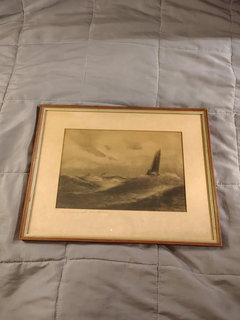 Tryck föreställande en segelbåt på stormigt hav. Verket är inramat.