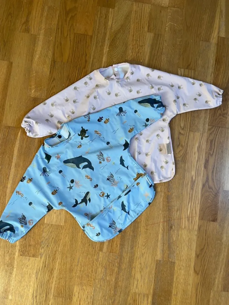 Två söta och praktiska haklappar med långa ärmar. Den ena har ett havsmotiv med valar, fiskar och sjöstjärnor på ljusblå bakgrund (från Liewood). Den andra har ett mönster med kaniner på ljusrosa bakgrund (OYOY mini). Haklapparna är perfekta för måltider och skyddar kläderna från spill. De är lätta att rengöra och återanvända. Kan tvättas i 30 grader.