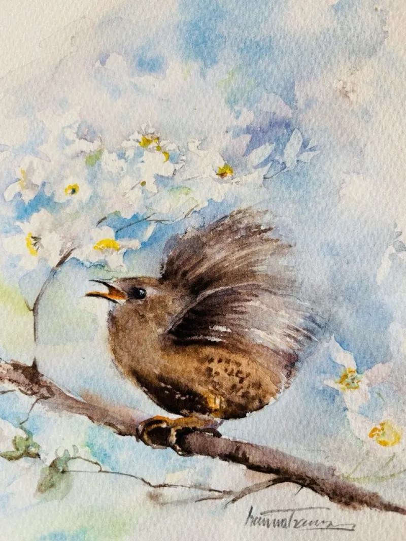Tradera Vacker akvarellmålning – Gärdsmyg i blommande träd^ Måleri