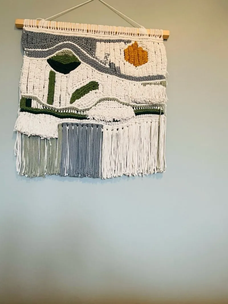 Handgjord väggbonad i macrame med olika färger och mönster. Perfekt för att addera en touch av bohemisk stil till ditt hem.