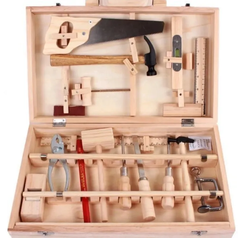 Det finns 16 barnverktyg med träförvaringslådor, inklusive: platta skruvmejslar och Phillips-skruvmejslar, klubbor, hammare, tänger, hyvlar, linjaler etc.