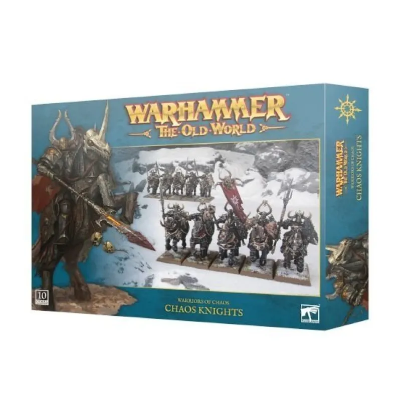 This multipart plastic kit builds 10 mounted Chaos Knights, powerful shock cavalry for Warriors of Chaos forces in games of Warhammer: The Old World. Each mounted Knight may be armed with either a hand weapon or a lance. Two of them can be built as a Champion, two more as standard bearers – each with a choice of two banner icons, and another two as musicians. That means you can build them as either two units of five, each with their own optional command, or as one large unit of 10. You'll also find options for heads, and there are plenty of optional accessories to personalise your unit.