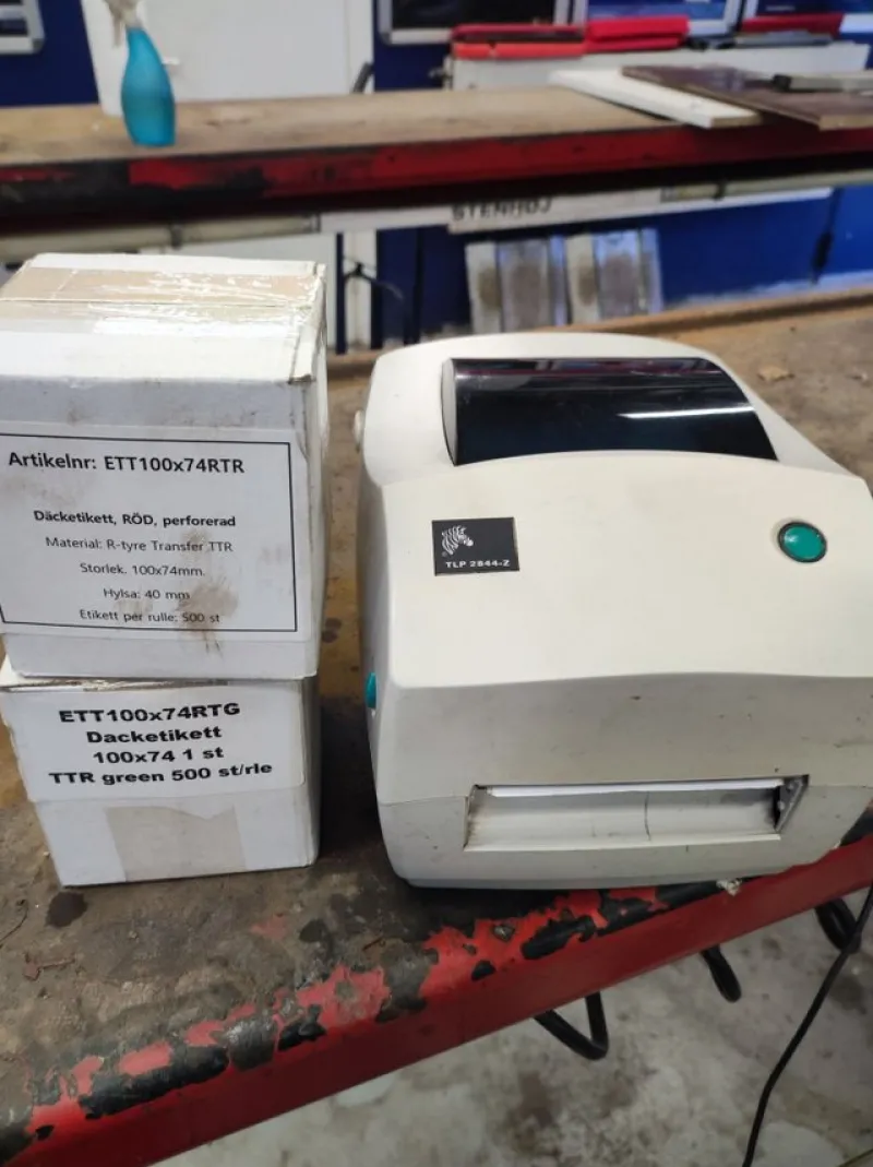 Zebra TLP 2844-Z etikettskrivare. Medföljer två rullar med ETT100x74 etiketter, en röd och en grön. Etiketterna är av typen R-tyre Transfer TTR, 100x74mm, med 40mm hylsa. 500 etiketter per rulle.