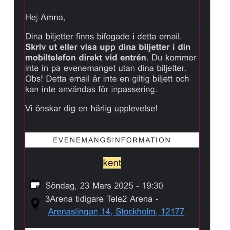En biljetter till konserten med Kent på 3Arena i Stockholm söndagen den 23 mars 2025 kl 19:30. Biljetterna finns som e-biljetter och kan antingen skrivas ut eller visas upp i mobilen vid entrén.