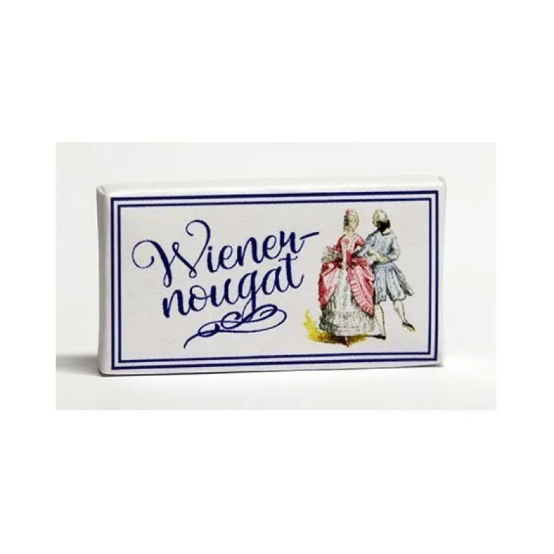Wienernougatask i miniatyr till dockskåp i skala 1:12. Förpackningen är av papper, tom och ej öppningsbar. Mått ca 1,4 x 2,7 cm.