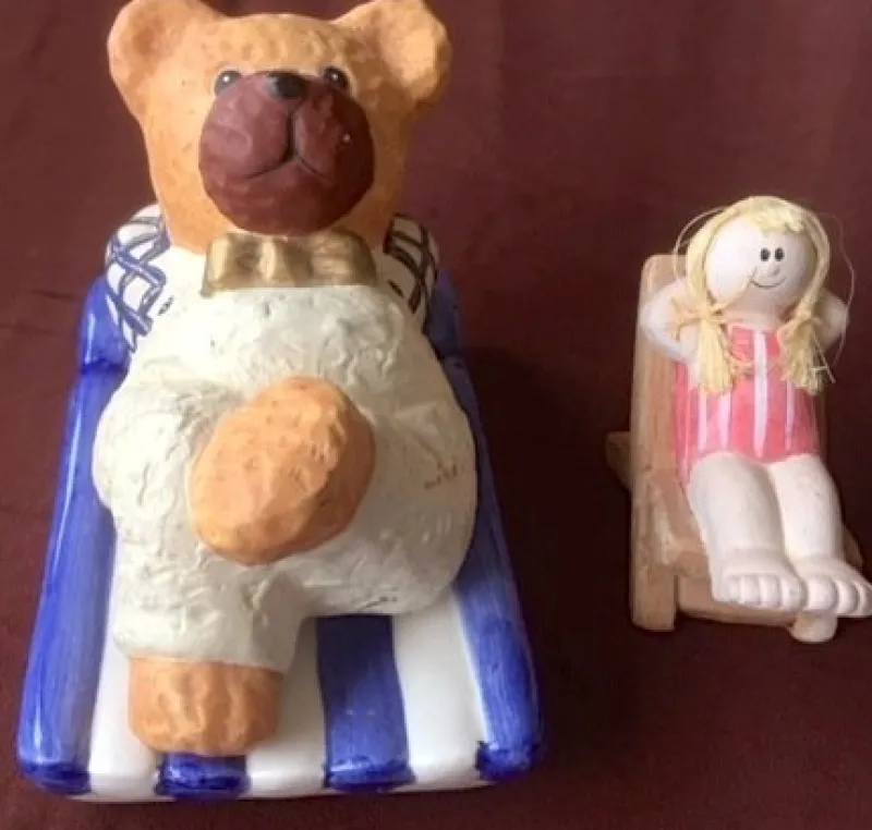 Fin glaserad blårandig Luftmadrass från Sia Collection, ca 15,5 x 10 cm – 6 hål på mitten och jag vet inte riktigt vad den ska användas till. – Nallebjörnen är nog i gips och lite smutsig, ca 15 x 8 x 8 cm. – Flickan med blonda flätor i solstolen är ca 9 x 4 x 8 cm i lite tyngre lera.